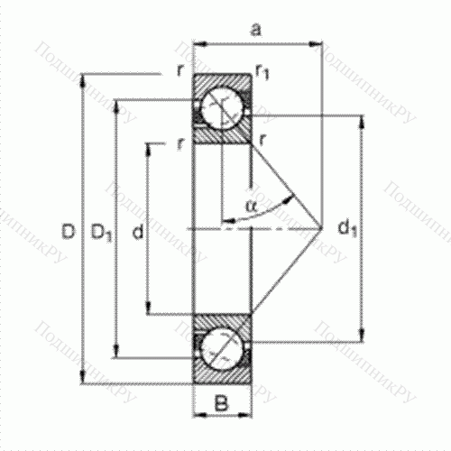 Основные размеры по DIN 628-1, угол контакта α = 40°