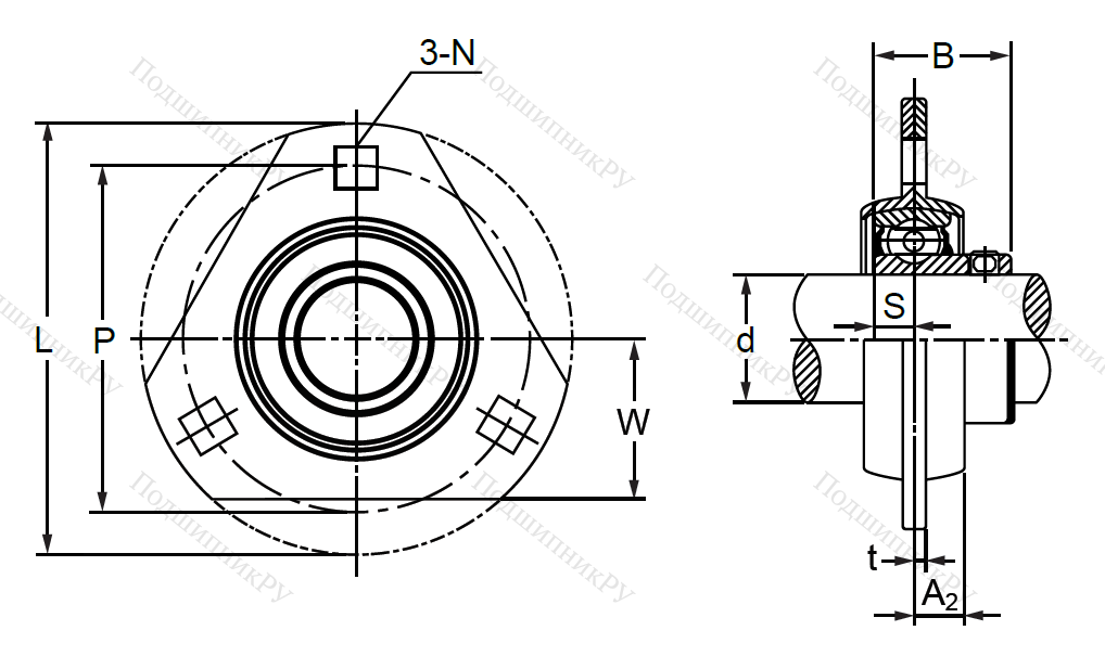 Фланцевая подшипниковая конструкция треугольной формы с тремя квадратными отверстиями, расположенными по углам и предназначенными для установки системы на вертикальной поверхности опоры. Состоит из двух одинаковых частей, созданных методом глубокой вытяжки во время штамповки. Установка на валу происходит посредству эксцентрикового кольца либо стопорных винтов. В зависимости от производителя, изделие может иметь метрические или дюймовые размерные параметры.